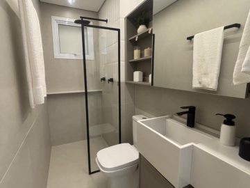Bancadas em granito branco marfim nos banheiros e cozinha.