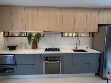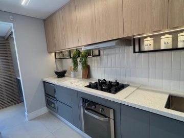 Bancada em granito cinza andorinha na cozinha e varanda/área de serviço.